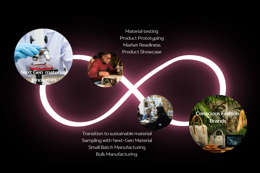We collobarate with Next-gen material innovators and Conscious Fashion Brands and together we raise the benchmark of responsible design where next-gen materials meet craft, creativity, and real-world scalability.