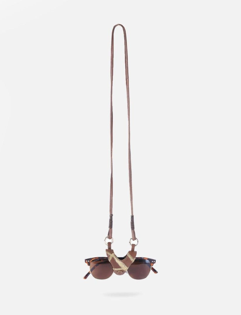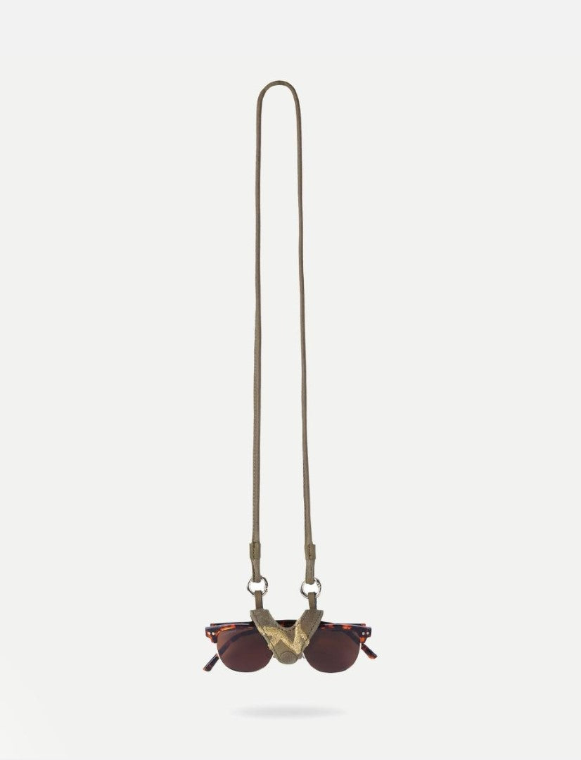 A minimal sunglass case, adorned with elegant golden accents and a detachable lanyard. Austere Kin is crafted from upcycled leather, embodying simplicity and durability, ready to accompany you on your daily adventures. Embrace sustainable style as you explore new fashion horizons with your sunglass neckpieces.