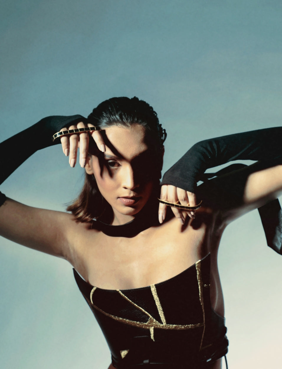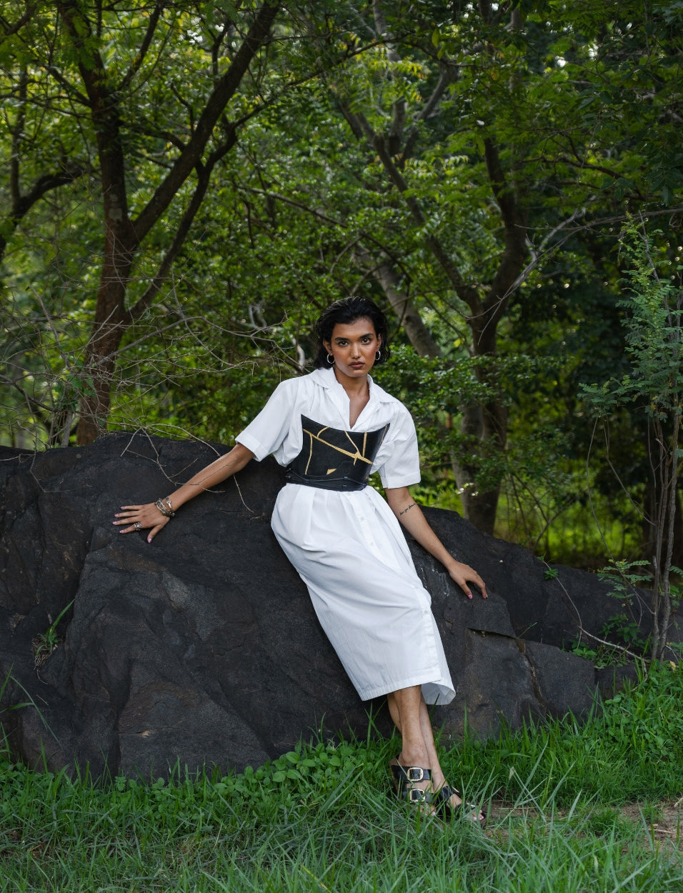 Meet the 'Eva Corset' in Black, an upcycled masterpiece. Crafted from upcycled leather scraps and mended with exquisite gold embroidery, this versatile accessory adds elegance to any outfit. Whether worn as a corset top or to accentuate the hips, it's a statement of style without compromise. The corset is secured with two supple waist straps, ensuring a perfect fit. Elevate your fashion game with Eva Corset, where sustainability meets sophistication.