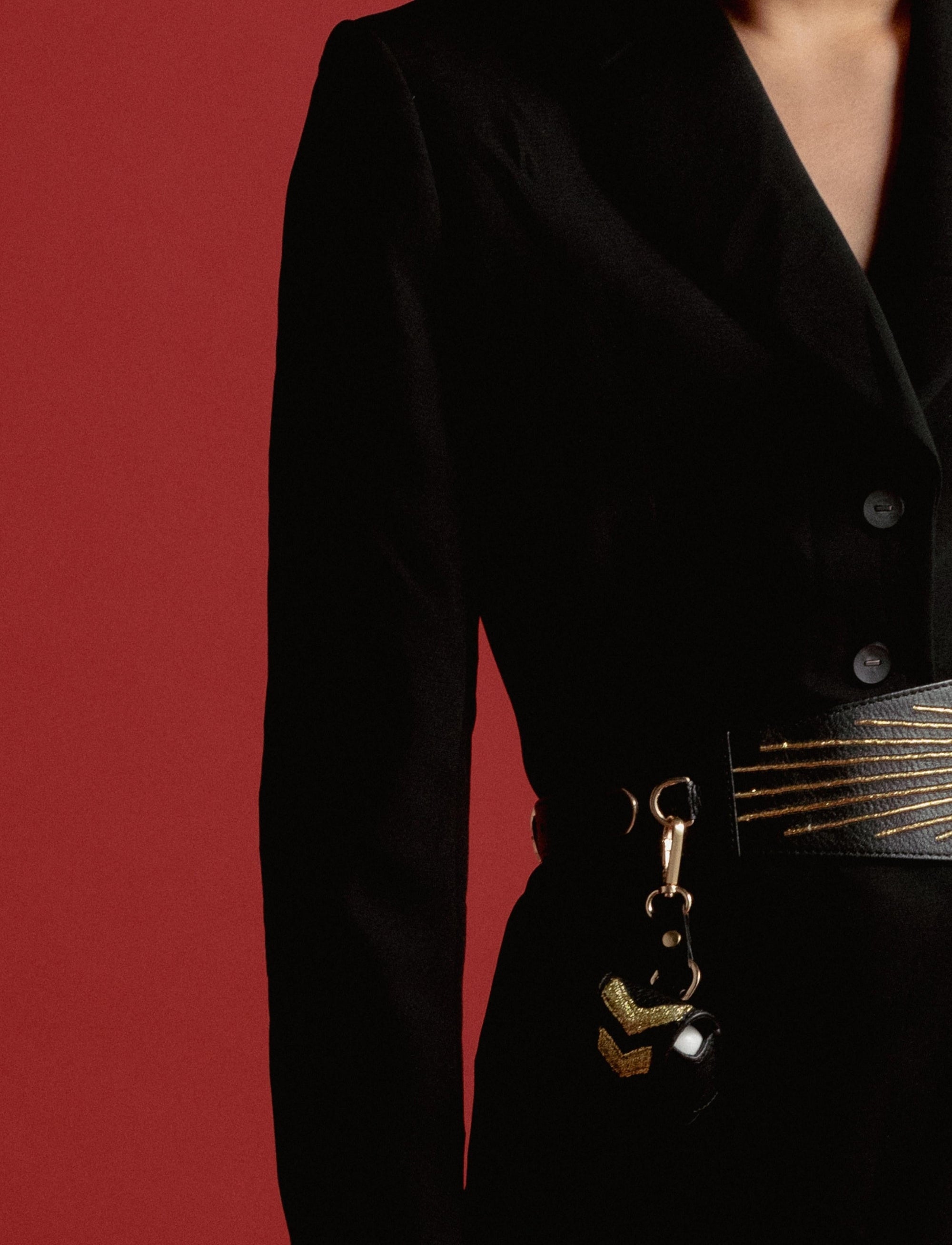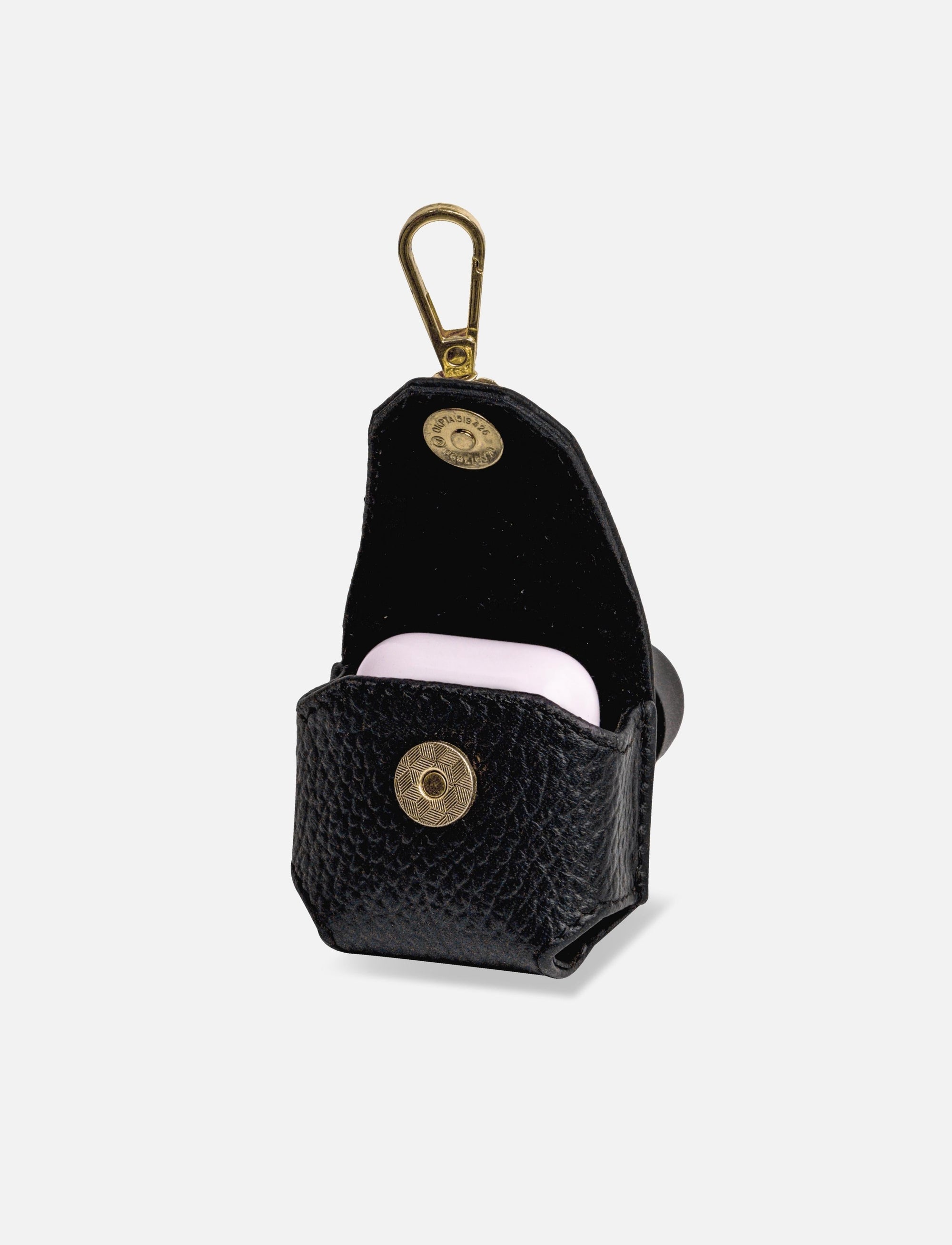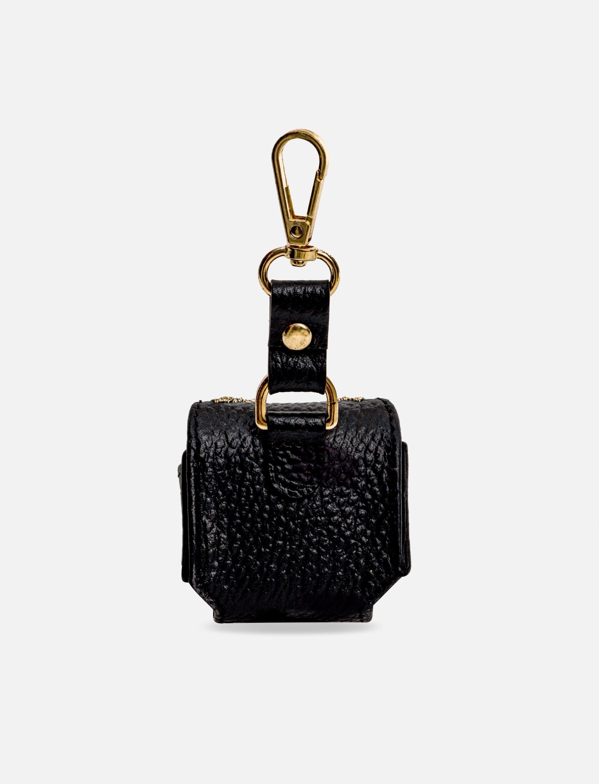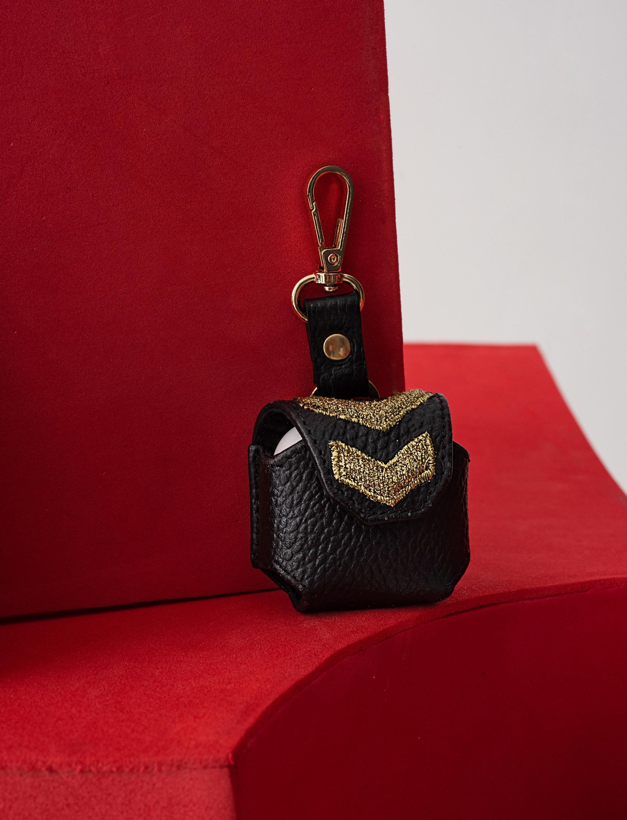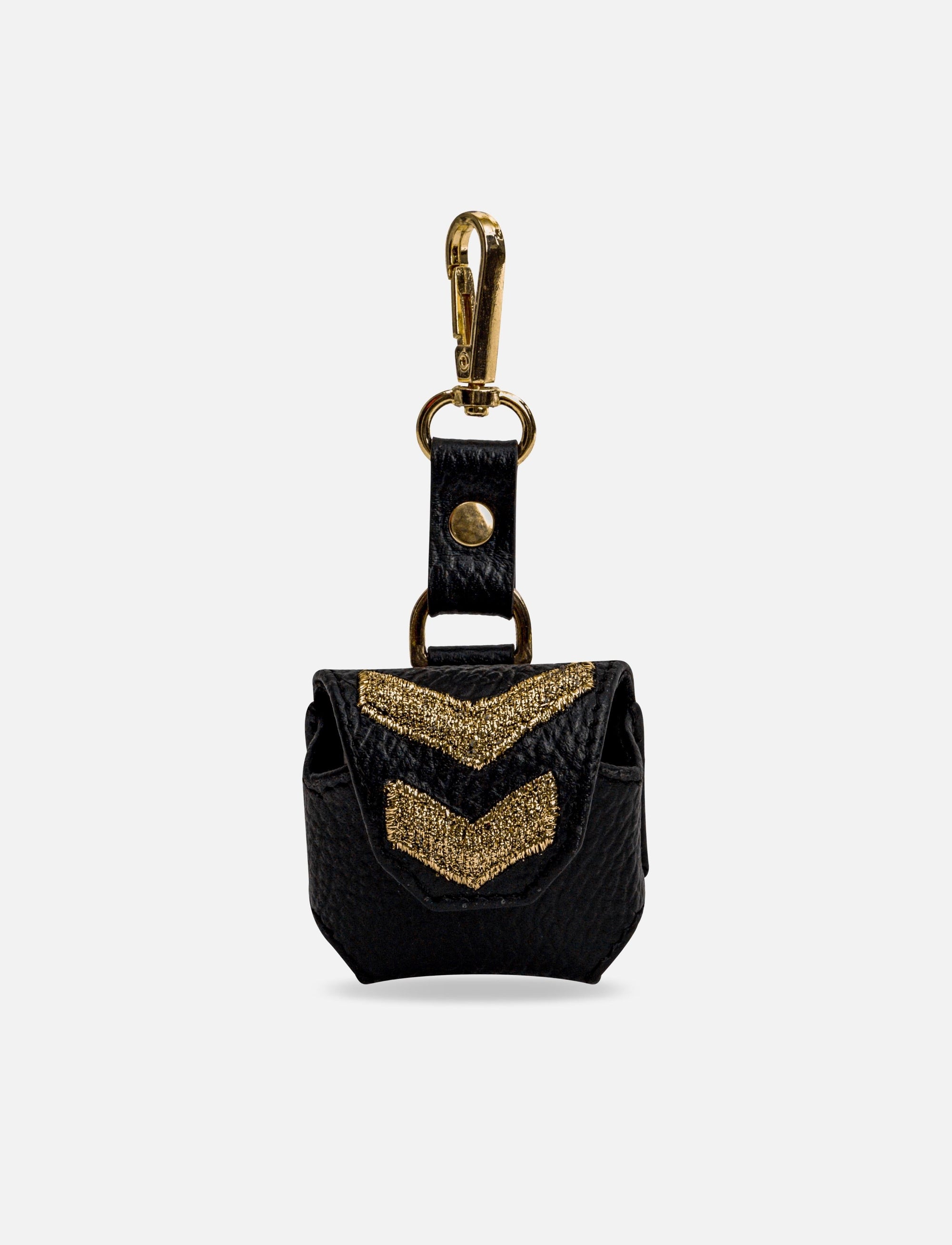A minimalist black leather case with a tinge of gold embellishment at the flap to remind you not to surrender to the ordinary! Protect your AirPods with a classy upcycled case.