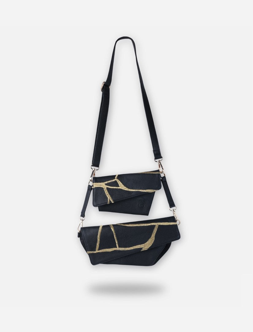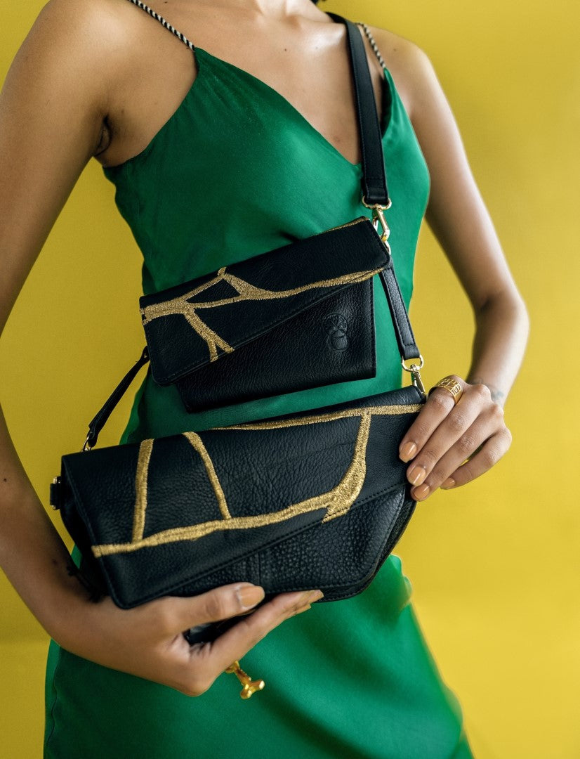 The Seiki Shiatsu Modular System is a true embodiment of sustainability and sartorial elegance. This innovative union seamlessly blends the Seiki Wallet and Shiatsu Cross Body Bag to cater to your diverse lifestyle needs. The design allows you to style it in multiple ways – carry the entire system or opt for just the wallet or crossbody bag, giving you flexibility like never before. Crafted from upcycled leather scraps with exquisite gold embroidery, it's a symbol of ethical fashion and environmental responsibility. The perfect companion for your essentials.